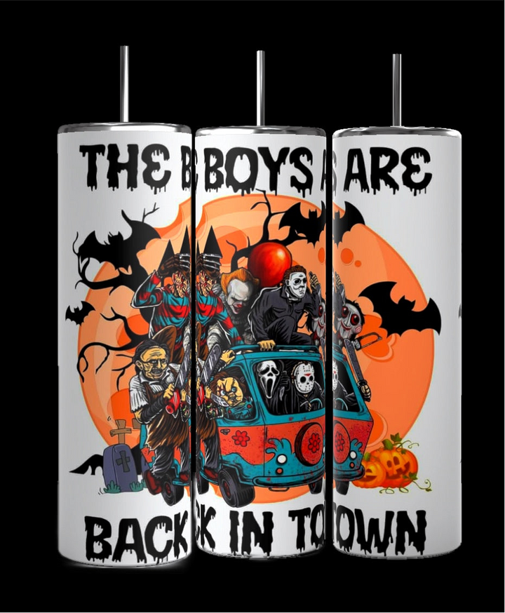 Introducing The Boys Are Back In Town 20oz tumbler this hilarious tumbler provides 360 degree humor for Halloween or any fan of fright! This 20oz tumbler is perfect for keeping your drinks hot or cold while making a bold fashion statement.