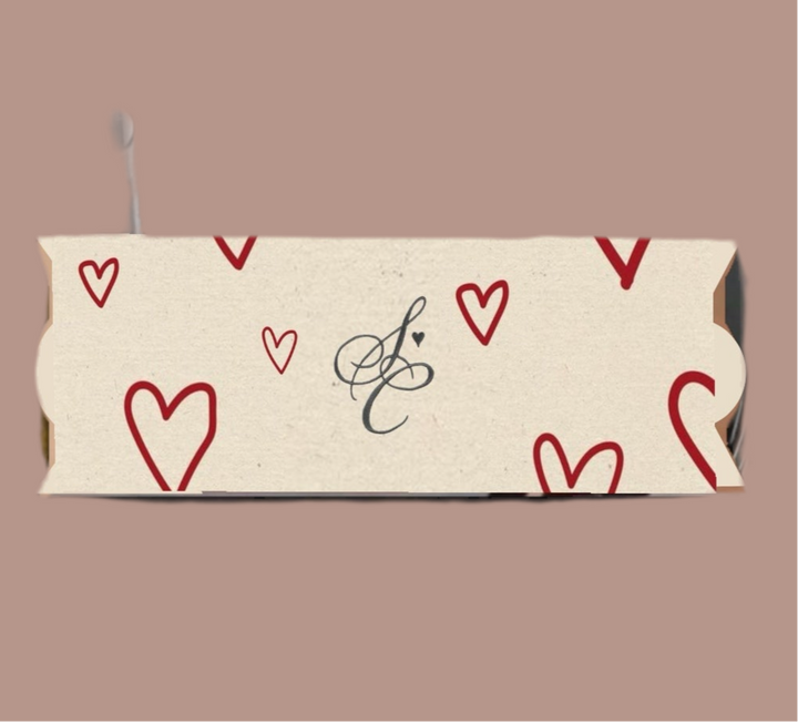 A silver tumbler filled with black liquid features a beige piece of tape adorned with red hearts and a cursive letter "E" on the lid. The tape covers the drinking hole while a clear straw is inserted into another hole, giving it the appearance of being topped with Kreative Kreationz's Sabrina Carpenter Heart Stanley Lid Plate/Topper.