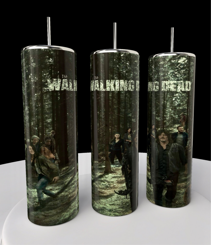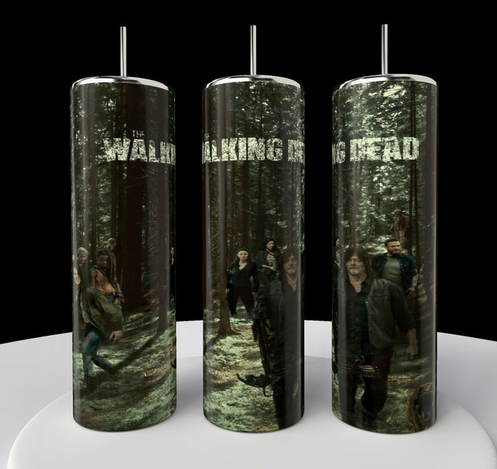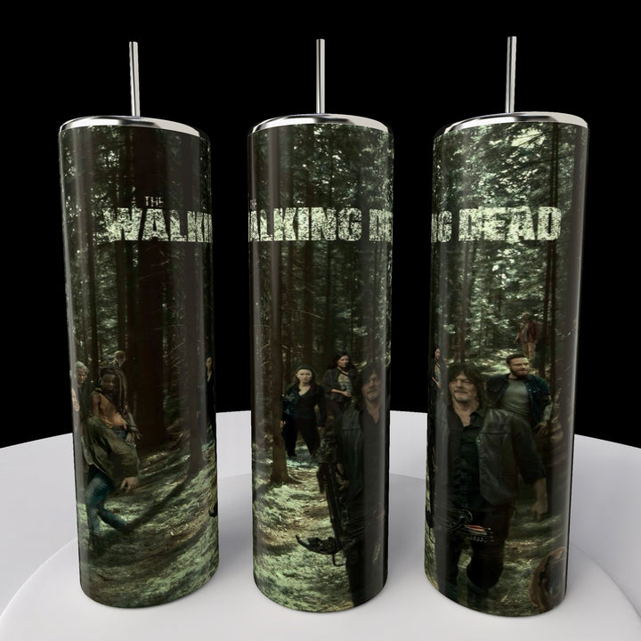 Kreative Kreationz offers a set of three 20oz stainless steel skinny tumblers featuring a forest scene and characters from The Walking Dead. Each tumbler displays part of the scene and the show's title on a dark background, creating an eco-friendly standout collection.