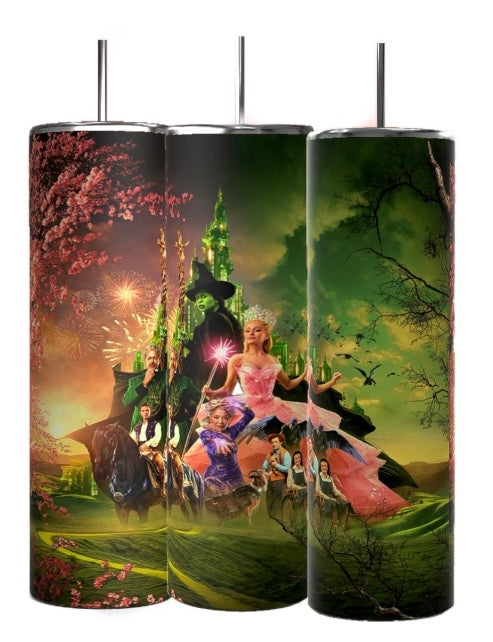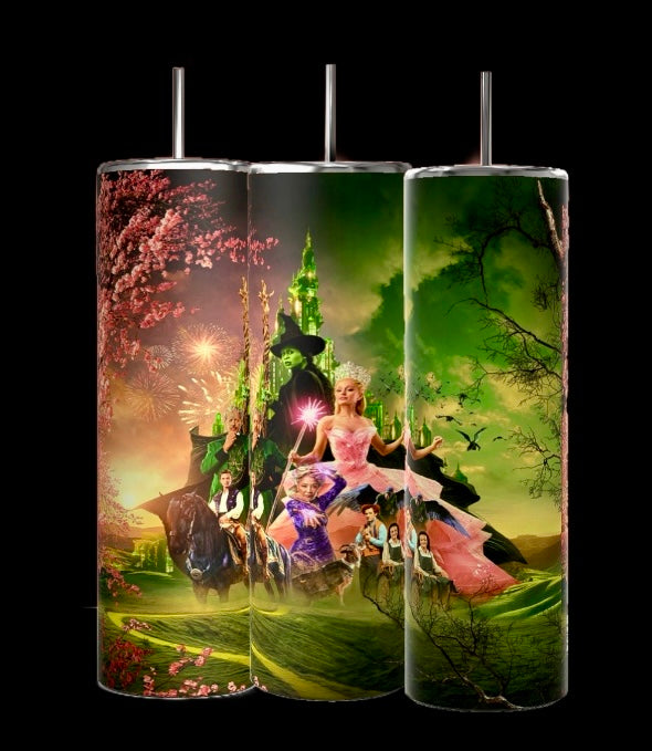 Three 20oz Wicked Skinny Tumblers by Kreative Kreationz feature a vibrant fantasy scene with a pink castle, fireworks, and medieval figures with horses. The design includes lush landscapes in green and pink hues. These insulated tumblers perfectly maintain your drink's temperature.