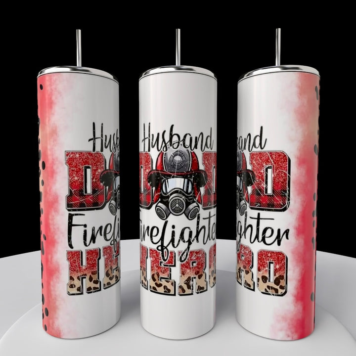 Three Kreative Kreationz Firefighter Dad 20oz Tumblers with lids and straws feature red, black, and leopard prints and "Husband Dad Firefighter Hero" text with a firefighter mask design, set on a kitchen counter.