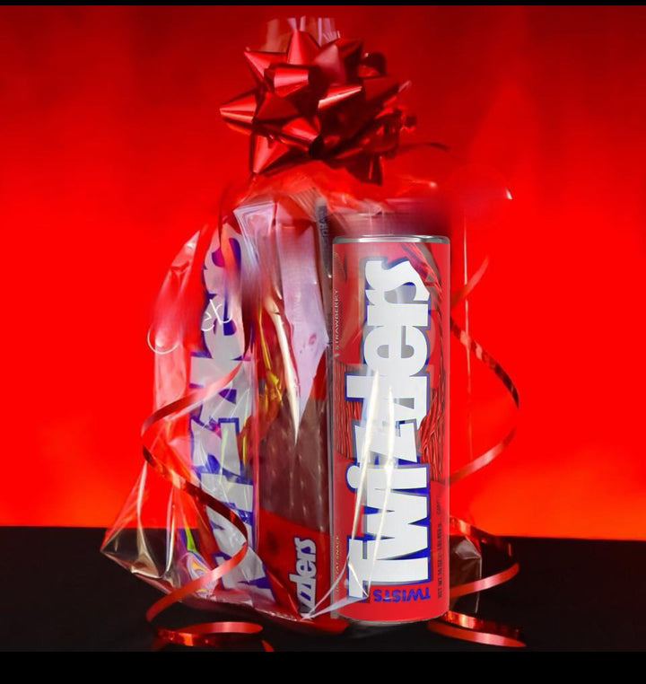 A gift-wrapped Kreative Kreationz Twizzler Tumbler/Candy Gift Set with a red bow and ribbons sits beside a sleek 20oz tumbler. The vivid red background contrasts beautifully with the tumbler's stainless steel finish, creating an eye-catching display.