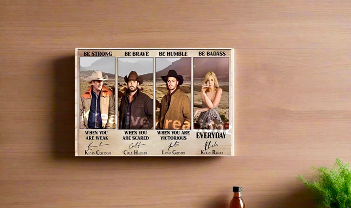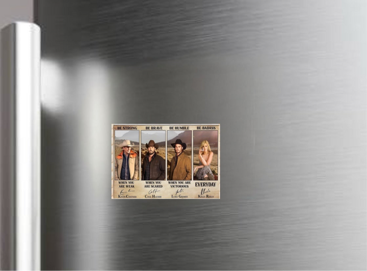 A Kreative Kreationz Fridge Magnet on a metallic surface features four people in Western attire, motivational phrases—"Be Strong," "Be Brave," "Be Humble," "Be Badass"—and includes signatures and names below each image.