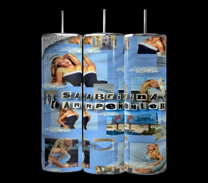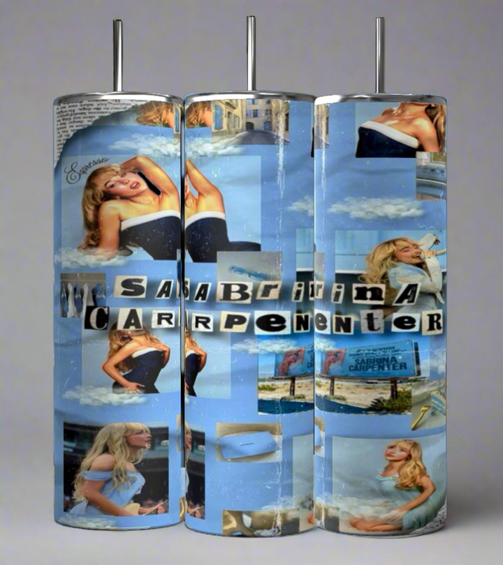 Three vertical Sabrina Carlenter Expresso 20oz Tumblers by Kreative Kreationz feature a collage of a blonde woman against blue, “Sabrina Carpenter” text across the center, and each comes with a spill-proof lid.