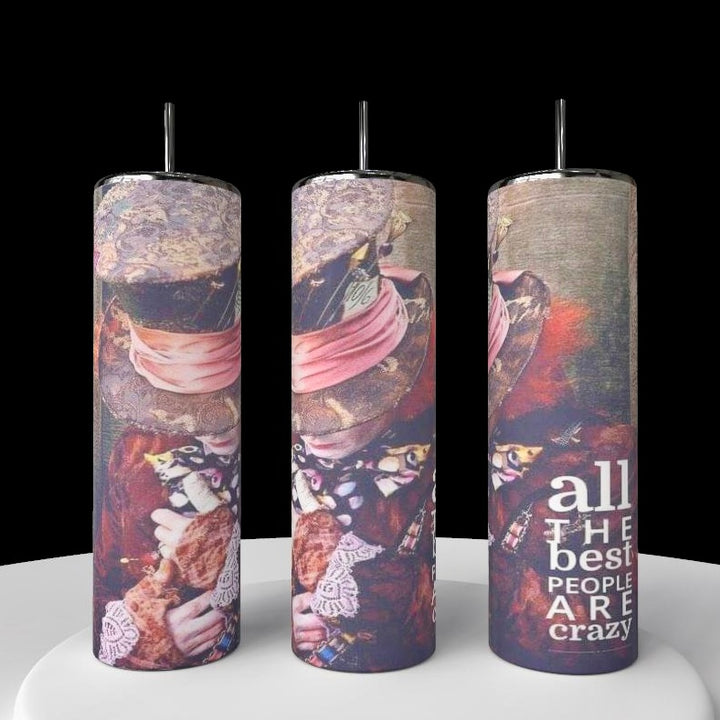 Set of three 20oz All the Best People are Crazy Tumblers by Kreative Kreationz, each featuring Mad Hatter designs. The right tumbler displays the quote "all the best people are crazy." Stainless steel, shown on a wooden surface.