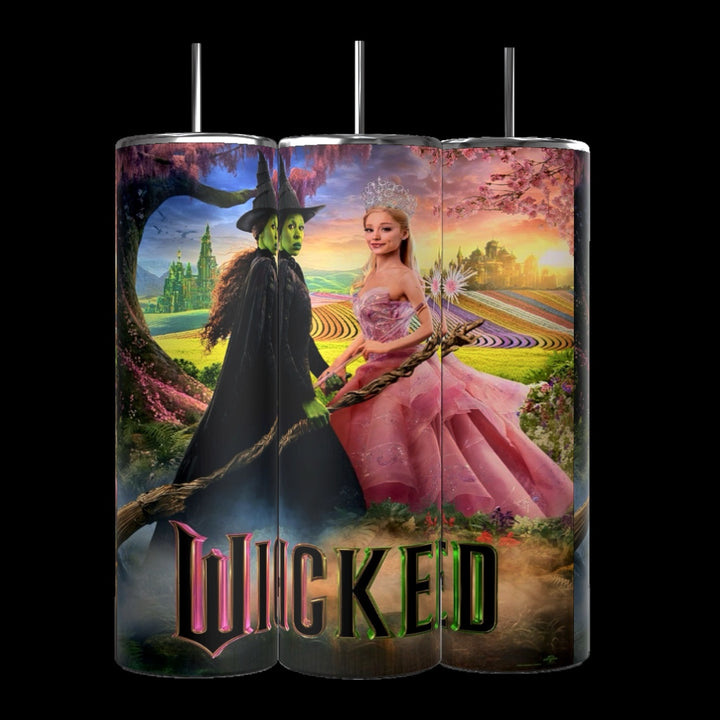 The Wicked 20oz Tumblers by Kreative Kreationz feature three tall designs with sublime artwork from the musical, showcasing a green-skinned character in black and another in a pink dress with a crown, all set against a vibrant fantasy backdrop.