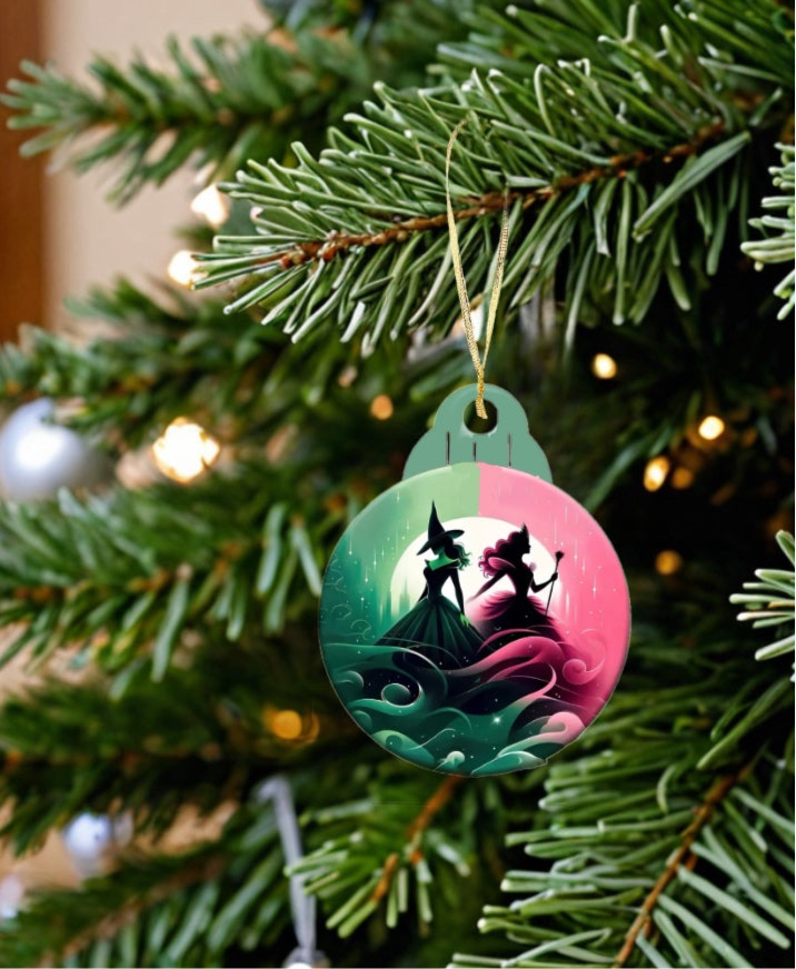 Introducing the Wicked Christmas Tree Ornament from Kreative Kreationz: a stunning round creation featuring a sublimated design of two witch silhouettes—one in green, the other in pink—set against an enchanting moonlit, swirling background. It elegantly suspends from a string amid the glow of colorful holiday lights.