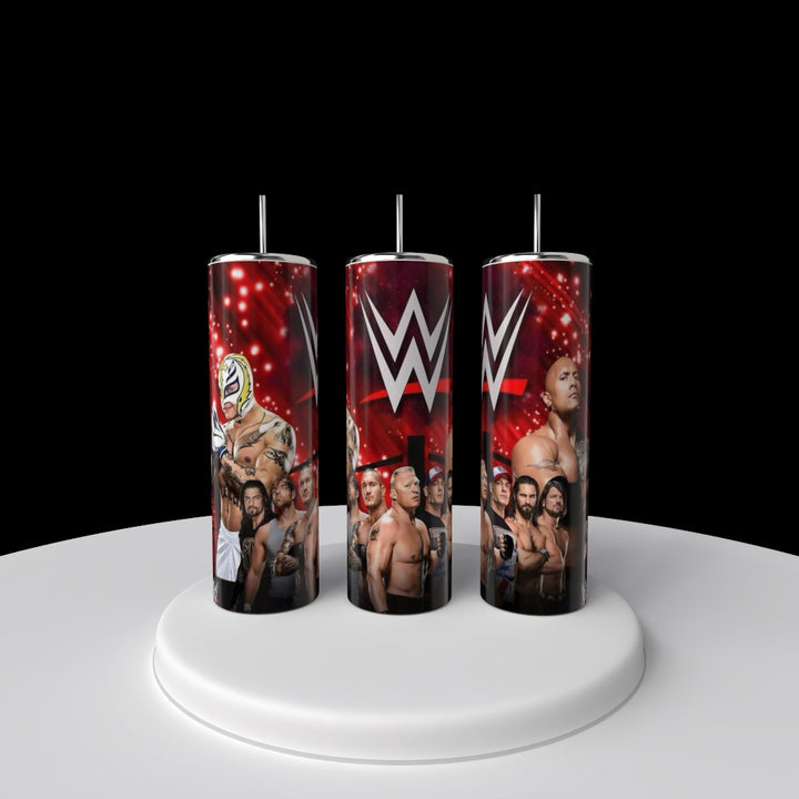 Three Kreative Kreationz WWF 20oz Tumblers featuring WWE superstars and the WWE logo are displayed on a wooden surface with star and red light accents, highlighting this eco-friendly drinkware.