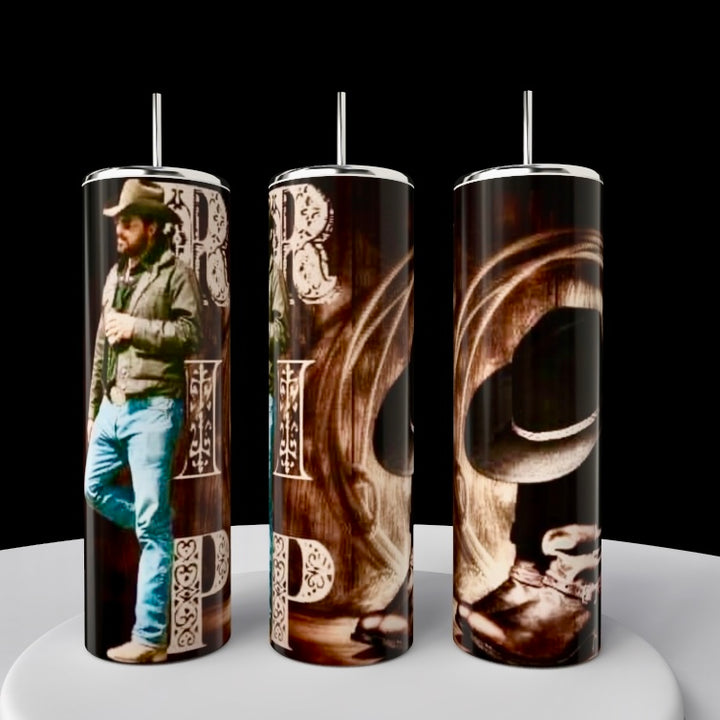 Three Kreative Kreationz Yellowstone RIP 20oz stainless steel tumblers with western-themed designs, featuring a cowboy and intricate lettering, stand proudly on a wooden surface against a blurred backdrop of forest and mountain.